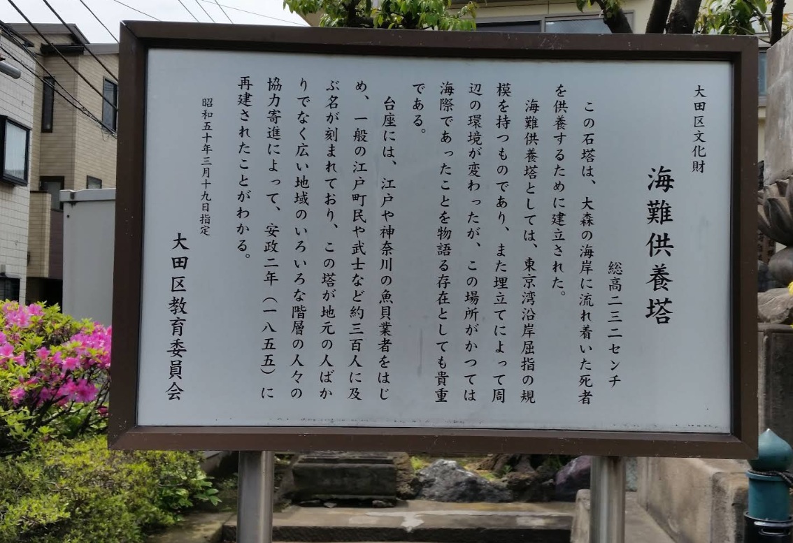 | 紹介 | 海難事故にあった人々を供養するため、安政2年(1855年)に建てられました。江戸市中や神奈川に及ぶ魚介業者をはじめ、町人、武士、役者等約300名の名が刻まれ、東京湾沿岸でも屈指の規模を持つものです。今では住宅や学校などが建ち並ぶ間にあります。区指定文化財。 |