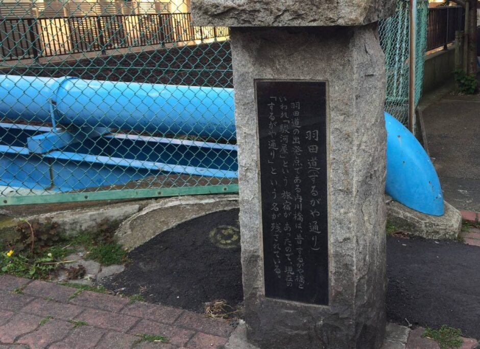 | 紹介 | 東海道から内川橋際(大森東二丁目2番先)で分かれ、羽田方面に至る道です。分岐点付近に、歌舞伎にも出てくる「駿河屋」という旅籠があったことから「するがや通り」とも呼ばれます。内川橋から大鳥居交差点(東糀谷三丁目3番先)まで旧道が残っています。産業道路ができるまで、羽田でとれた魚などを運ぶ生活道路でした。 |