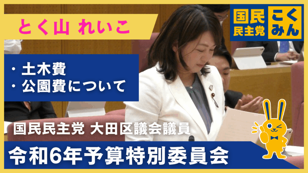 質疑動画 大田区議会/令和6年予算特別委員会令和6年3月14日(審査第5日)款別質疑② 国民民主党大田区議会議員 とく山れいこ 【款別質疑】1.土木費・公園費について
