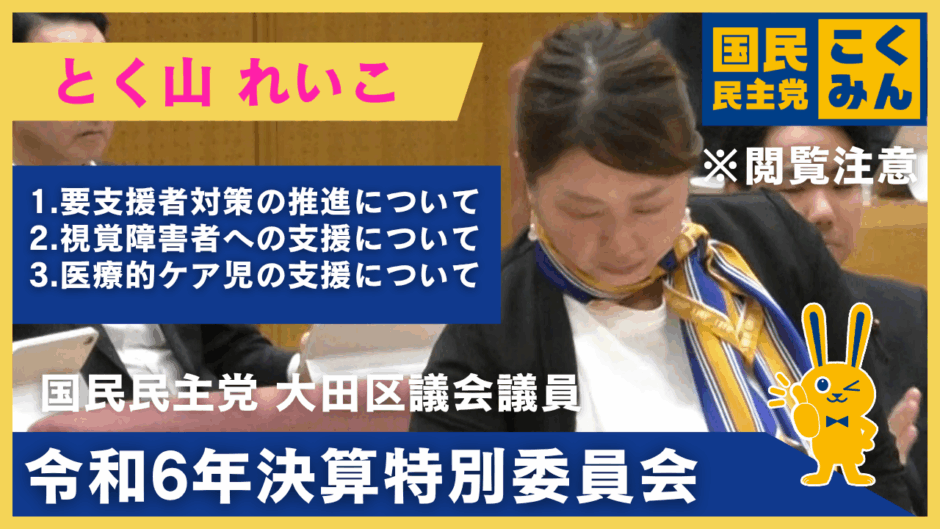 ホーム議会動画 とく山れいこ | 令和6年決算特別委員会【審査第3日:款別質疑①】 2025年10月28日 SHARE ポスト シェア はてブ LINE 質疑動画 大田区議会/令和6年決算特別委員会令和6年10月2日(審査第3日) 【款別質疑】・要支援者対策の推進・視覚障害者への支援について・医療的ケア児の支援について