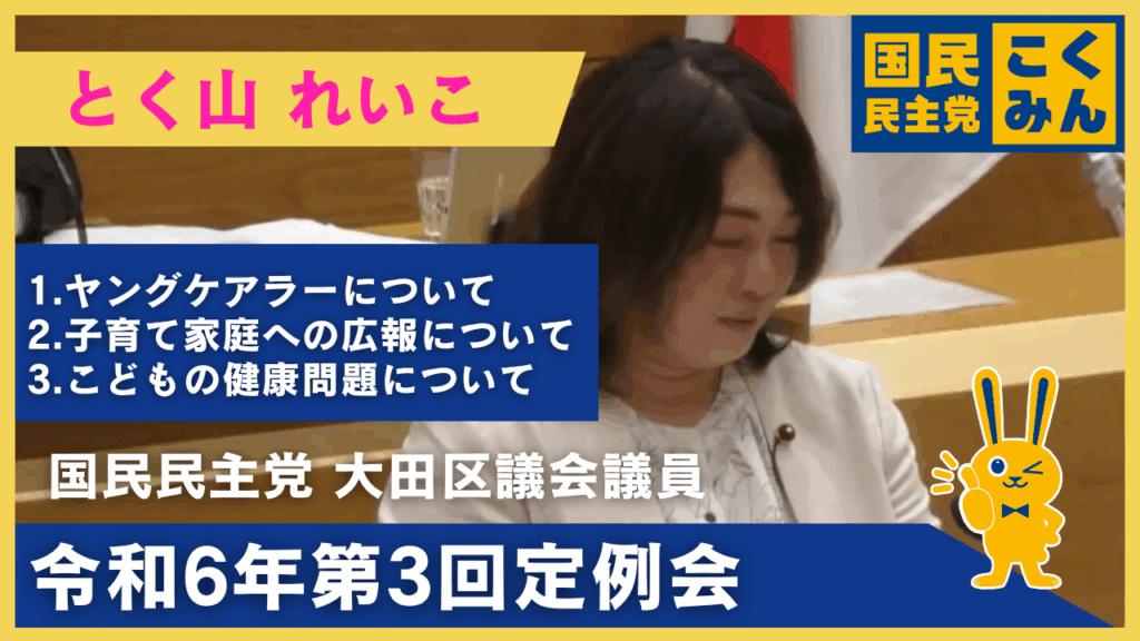 質疑動画 大田区議会/令和6年第3回大田区議会定例会令和6年9月17日(第2日) 【代表質問】1.ヤングケアラーについて2.子育て家庭への広報について3.こどもの健康問題について