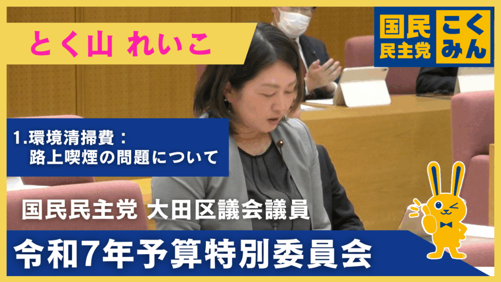 質疑動画 大田区議会/令和7年予算特別委員会【審査第6日 款別質疑】令和7年3月17日(審査第6日) 【款別質疑】1.環境清掃費: 路上喫煙の問題について