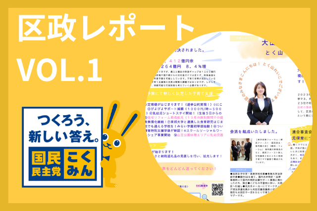 この度、私の活動をご報告するため「区政レポート VOL.01」 を発行いたしました。 2023年4月に初当選してからの一年間の主な活動 や、2024年3月に可決された「令和6年度 大田区予算」 のポイントについて、現役子育て世代の視点 からまとめています。